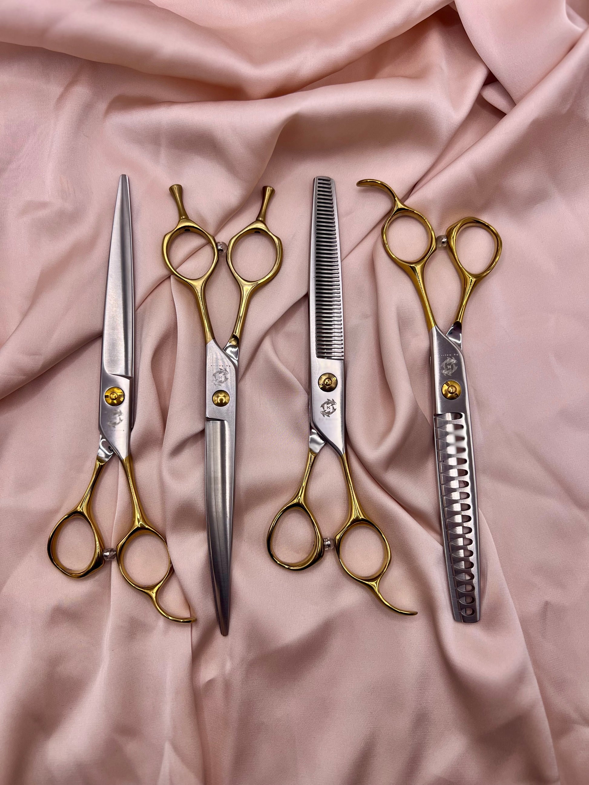 Crafted from premium Japanese 440C steel, each scissor delivers exceptional sharpness, durability, and smooth cutting action. The gold ergonomic handles provide comfort, balance, and control, while the striking design adds a touch of elegance to your toolkit.